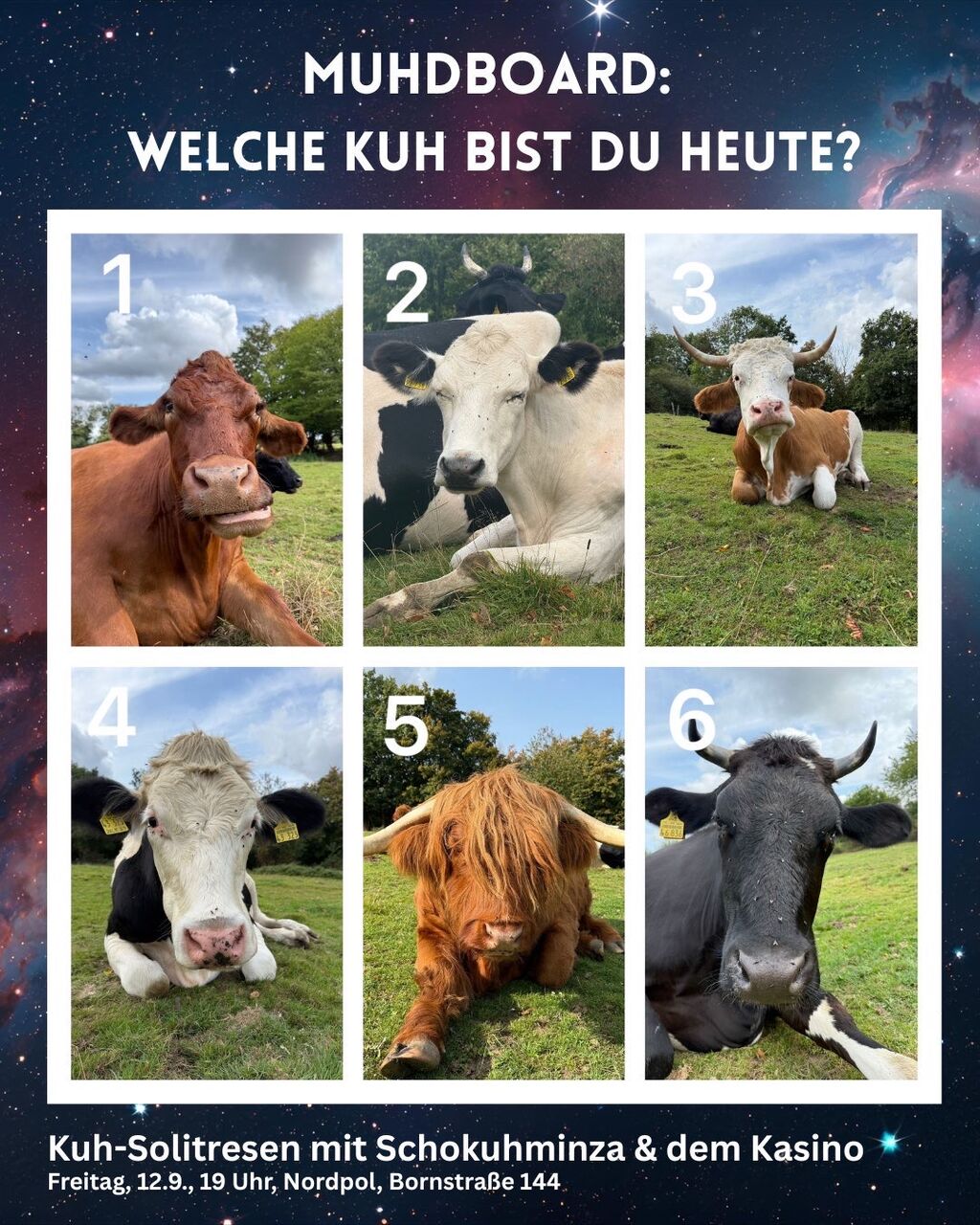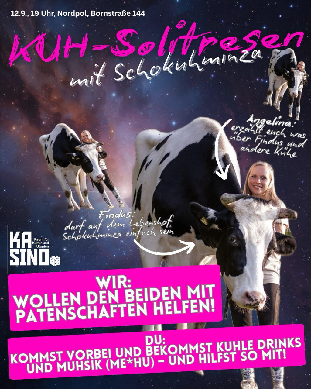 Was wir bei diesem Kuh-Solitresen an Spenden einsammeln dürfen, geht komplett in Patenschaften für die Kühe von Schokuhminza, also für Lumi, Findus, Dominik und den Rest der Herde. Dich brauchen wir dafür: Komm vorbei, mach's dir gemütlich oder pack deine kuhlsten Dancemoves aus und mach unsere Specials leer.