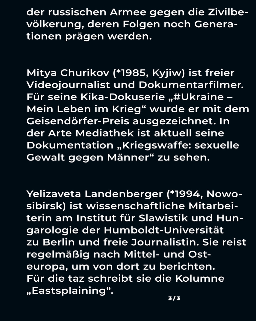 Mitya Churikov (*1985, Kyjiw) ist freier Videojournalist und Dokumentarfilmer. Für seine Kika-Dokuserie „#Ukraine – Mein Leben im Krieg“ wurde er mit dem Geisendörfer-Preis ausgezeichnet. In der Arte Mediathek ist aktuell seine Dokumentation „Kriegswaffe: sexuelle Gewalt gegen Männer“ zu sehen.