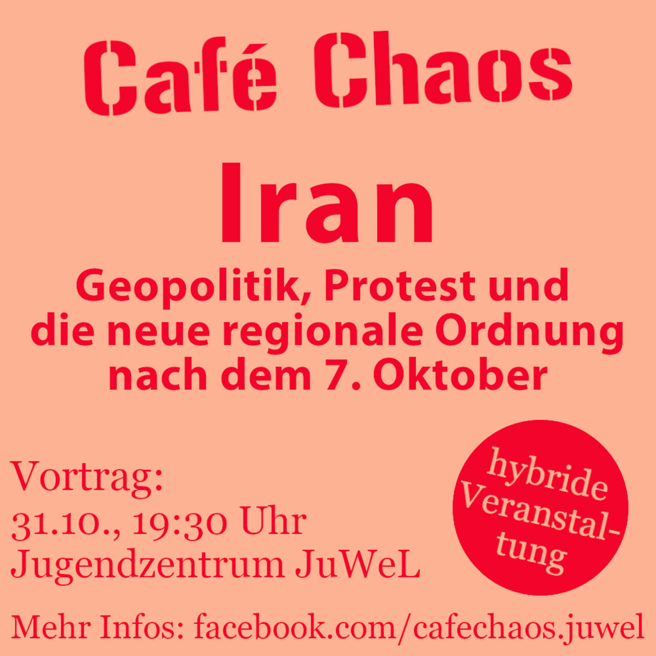 Bereits zum vierten Mal wirft das Café Chaos in seiner Vortragsreihe im Jugendzentrum JuWeL seit der 2022 entstandenen Protestbewegung einen Blick auf die politischen Entwicklungen im Iran. Der Vortrag beginnt um 19:30 Uhr, Einlass vor Ort ist ab 19 Uhr.