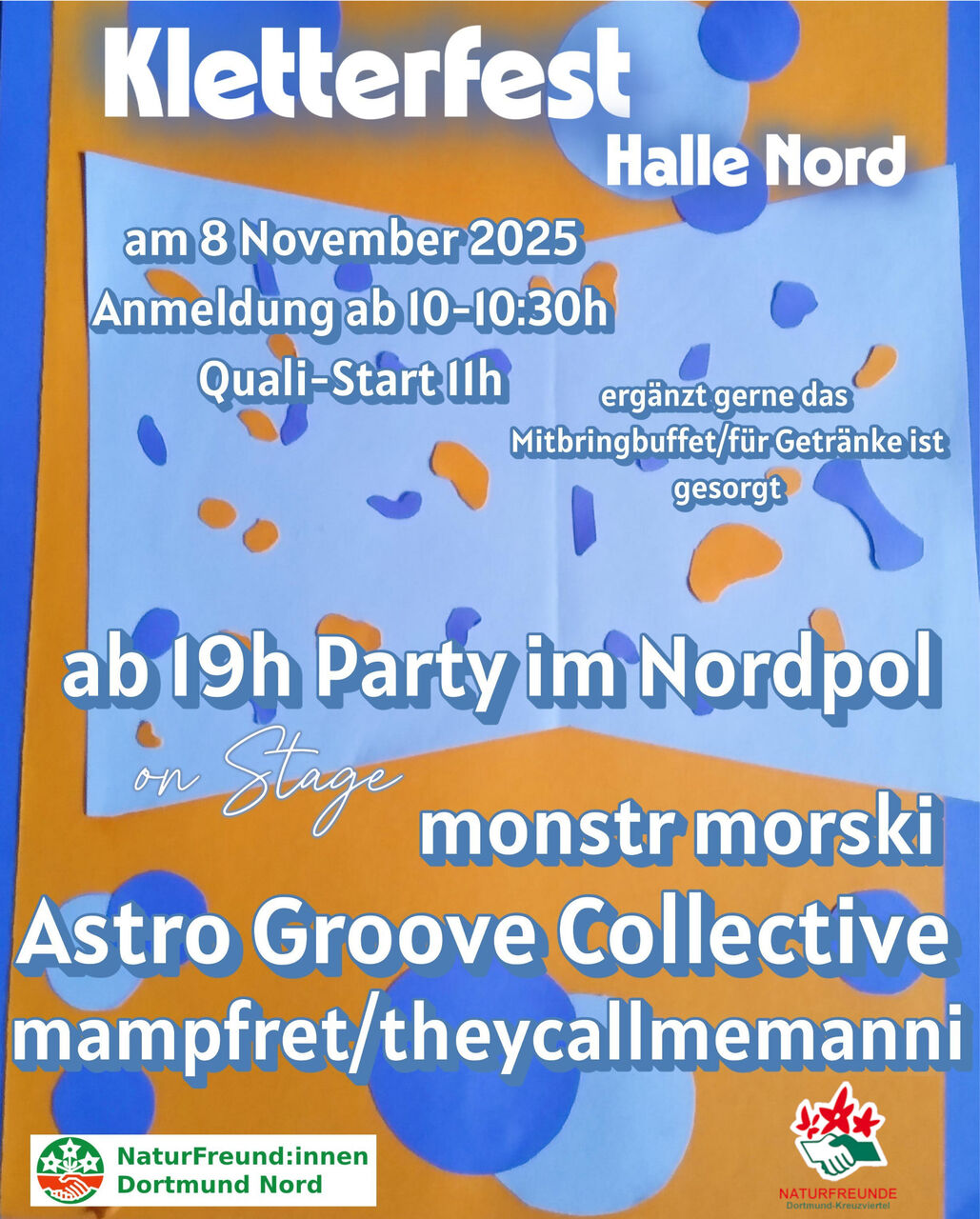Die Klettergruppen der OG Dortmund Kreuzviertel und der OG Dortmund Nord feiern das Saisonende mit einem Kletterfest in der Sporthalle Nord I und anschließender Party im Nordpol.