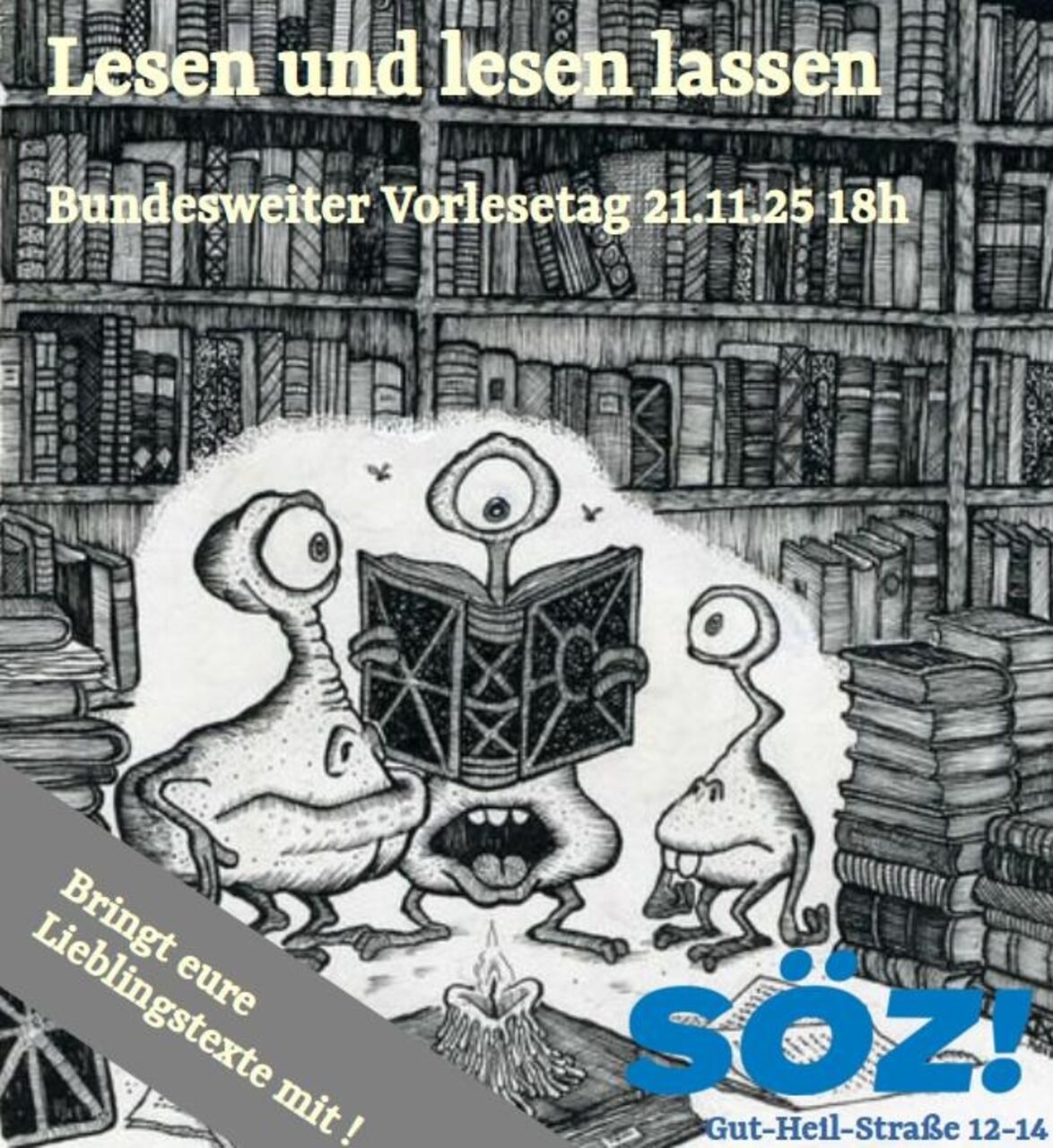 Anlässlich des bundesweiten Vorlesetages der dieses Jahr am 21.11.2025 unter dem Motto „Vorlesen spricht Deine Sprache“ stattfindet, laden wir “die Großen” abends ab 18:00 Uhr zum gemütlichen Beisammensein und vorlesen (lassen) ins SÖZ-Café ein.