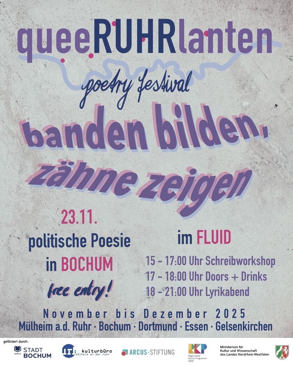 “Banden bilden, Zähne zeigen” ist das diesmalige Motto für das queeRUHRlanten poetry festival. Freut euch auf einen (queer)politischen Lyrikabend im Bochumer Fluid