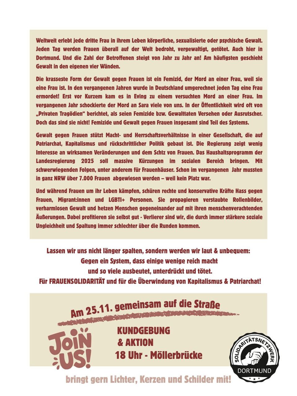 Am 25.11. wollen wir Frauen gemeinsam laut werden für Frauensolidarität und die Zerschlagung des Patriarchats!
