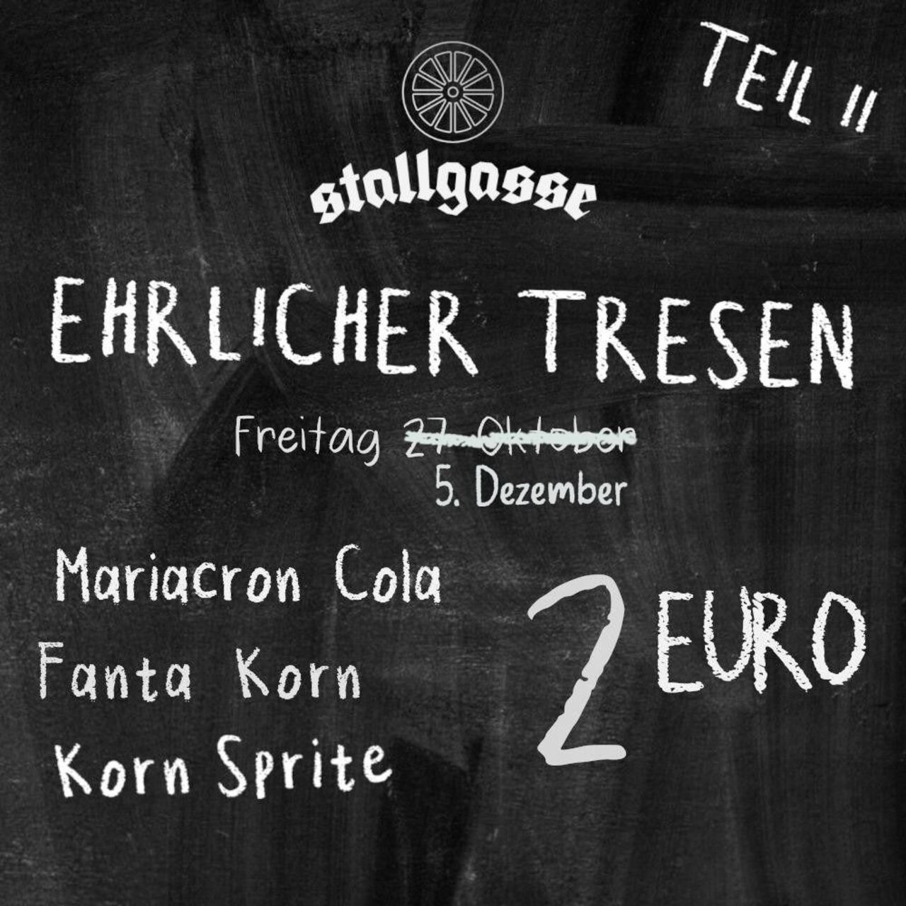 Ehrlicher Tresen in der Stallgasse. Freut euch auf WDR aus der Dose und leckere Getränke aus'm Glas!