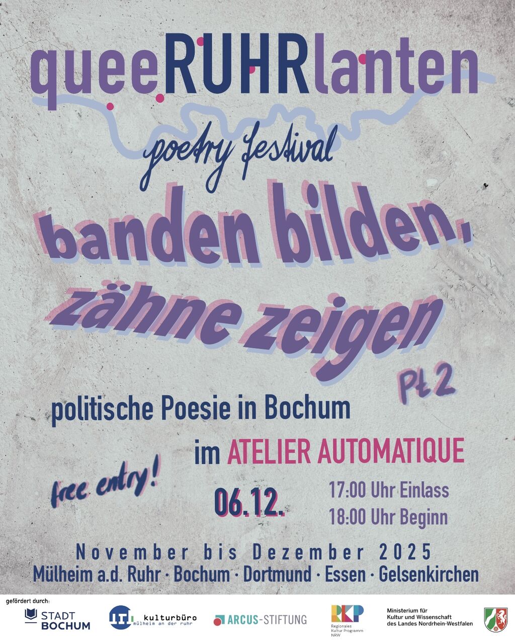 Die Veranstaltungsreihe wird gefördert durch die Stadt Bochum, das Kulturbüro Mülheim an der Ruhr, die Arcus-Stiftung und das Regionale Kulturprogramm Ruhr vom Ministerium für Kunst und Wissenschaft des Landes NRW.
