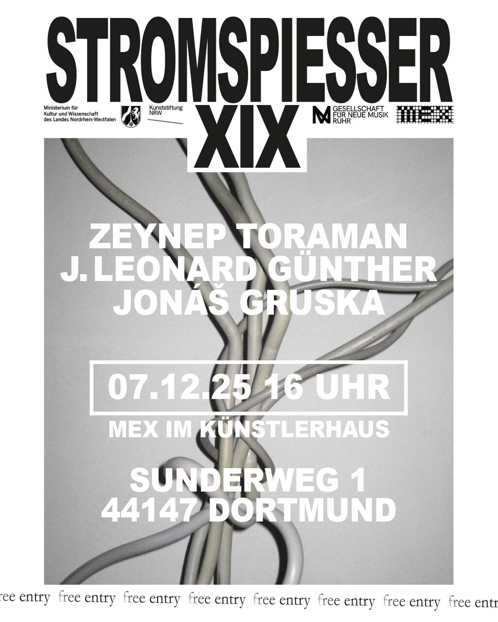 Das Jahr geht langsam, aber sicher, zu Ende und damit auch das stromspiesser-Jahr 2025. Eine letzte Überraschung bleibt noch aus: Zeynep Toraman aus Istanbul zeigt wie Texte (im weitesten Sinne des Wortes) innerhalb des größeren Rahmens musikalischer Kompositionen miteinander interagieren können, Lokalheld J. Leonard Günther bringt ein bisschen Essen nach Dortmund und Jonáš Gruska aus Bratislava zeigt seine modulare Skulptur „Axis Mundi Sound Distribution System". Eine heilige Dreifaltigkeit, die nicht sehr heilig ist.