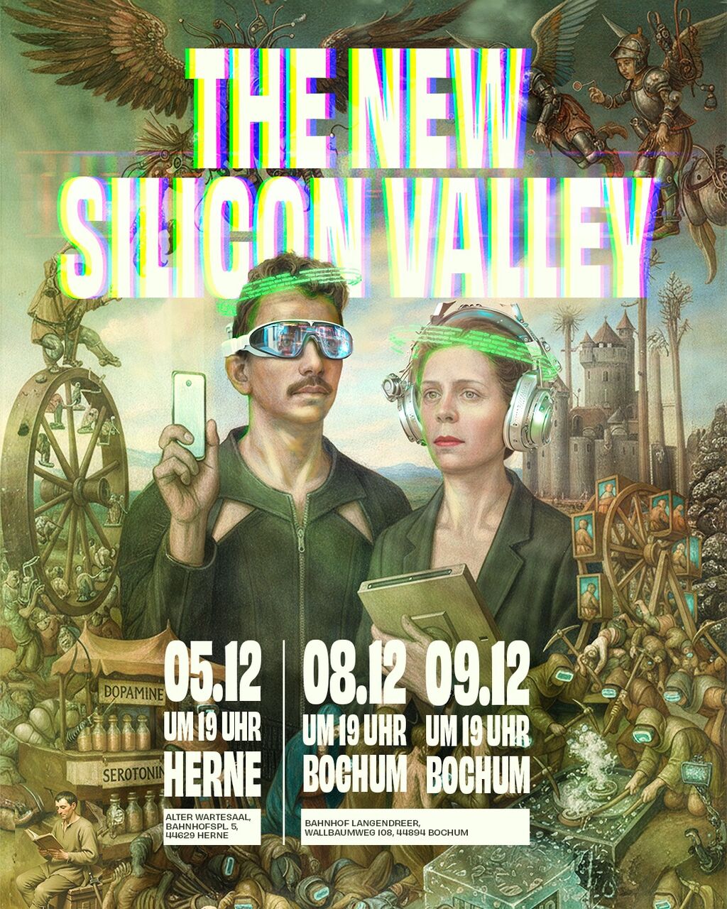 DESLOCAR entwirft mit THE NEW SILICON VALLEY eine poetisch-dystopische Sci-Fi im Solarpunk-Look. Inspiriert von Ruhr- und anderen Bergbauregionen wird in der Performance die Frage verhandelt, was der Bergbau des digitalen Zeitalters ist und nach welchen Rohstoffen wir heute schürfen. Knochen werden zu Gold, Daten zu Rohstoffen – eine kraftvolle Metapher für digitalen Extraktivismus, soziale Ungleichheit und techno-feudale Macht. Die Inszenierung zeigt eine fiktive Zukunft, welche die Schattenseiten technologischer Innovationen aus migrantischer Perspektive beleuchtet. Auf humorvolle Weise widmet sie sich den provokanten Fragen: Was ist der wahre Preis für digitale Utopien und was sind wir bereit, dafür zu zahlen? Würdest du deinen Arm verkaufen, um dir ein Haus leisten zu können?