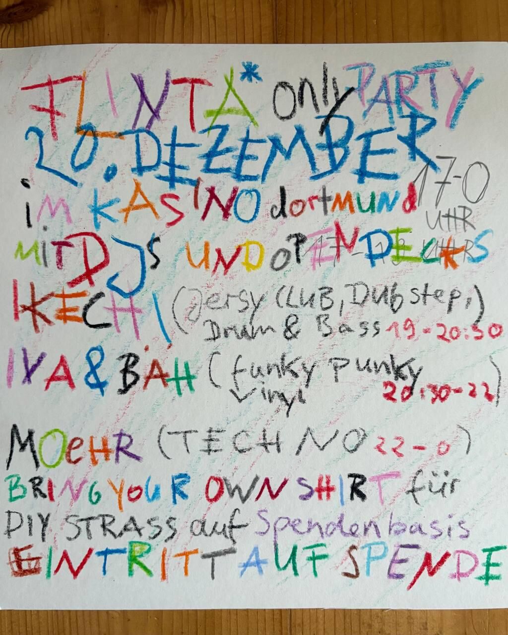 Checkt auch nochmal das Awareness Konzept vom Kasino. Wir möchten, dass sich alle auf der Veranstaltung wohl, aber auch füreinander verantwortlich fühlen. Bei Schwierigkeiten sind die Veranstalterinnen an dem Abend zu erkennen und können insbesondere an der Tür, der Theke und auch auf dem floor angesprochen werden. Wir freuen uns auf euch!
