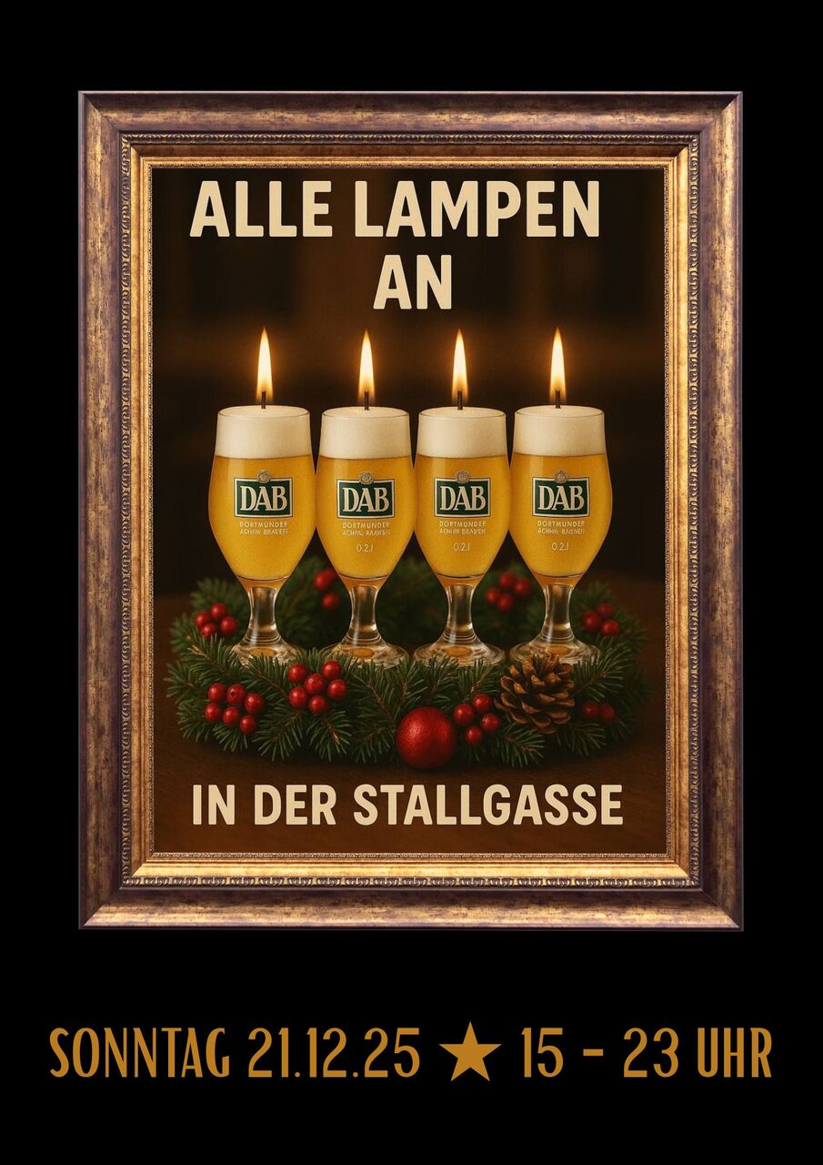 Kurz vor den Feiertagen öffnen wir pünktlich zum 4. Advent noch einmal außerplanmäßig die Stallgasse für euch. Neben unseren üblichen Kaltgetränken erwarten euch eine kleine Auswahl an weihnachtlichen Snacks sowie winterliche Heißgetränke.