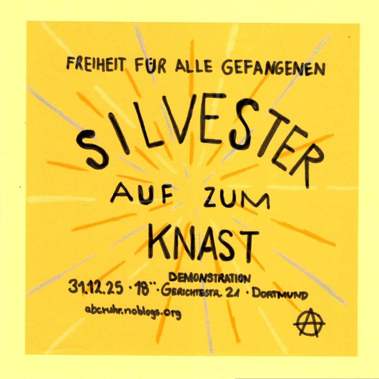 Also kommt am 31.12. nach Dortmund. Wir sind laut, wir sind solidarisch und mit Stimme, Wut und Entschlossenheit wollen wir für die Gefangenen in Dortmund auch diese Jahr brüllen: Ihr seid nicht allein!
