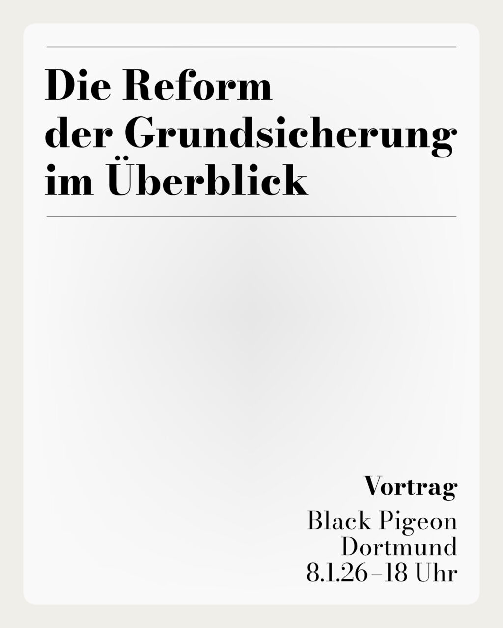 Sharepic für Die Reform der Grundsicherung im Überblick am 8.1. Das Bild hat einen weißen Hintergrund, mit einer cremefarbenen Umrandung, wodurch der weiße Bereich wie ein Stück quadratisches Papier aussieht. Im weißen Bereich steht oben zwischen zwei horizontalen Linien “Die Reform der Grundsicherung im Überblick”. Unten rechts in der Ecke steht “Vortrag Black Pigeon Dortmund 8.1.26 – 18 Uhr”