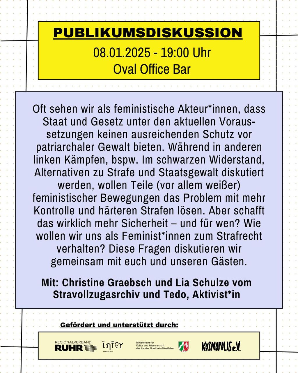 Publikumsdiskussion zu feministischen Ansätzen zu Gewalt, Strafe und Staat mit Prof. Christine Graebsch und Lia Schulze (Strafvollzugsarchiv) und Tedo (Aktivist*in)