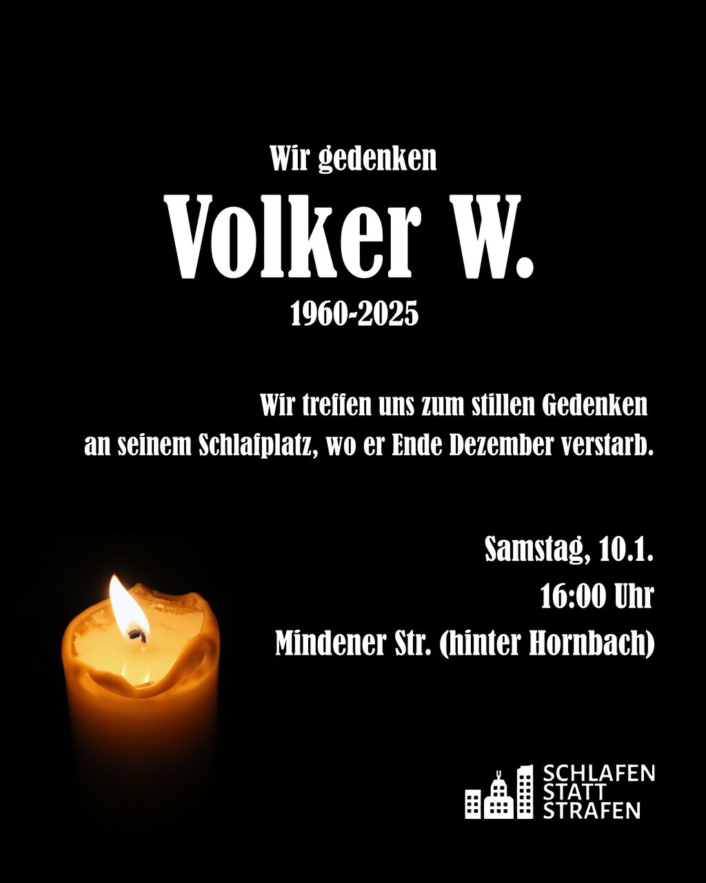 Wir wissen nicht mit absoluter Sicherheit, woran Volker gestorben ist, eventuell war es ein Herzinfarkt. Auf jeden Fall ist das Leben auf der Straße ein Zustand von andauerndem Stress, der einen krassen Einfluss auf die psychische und physische Verfassung der Menschen hat. Obdachlosigkeit tötet.