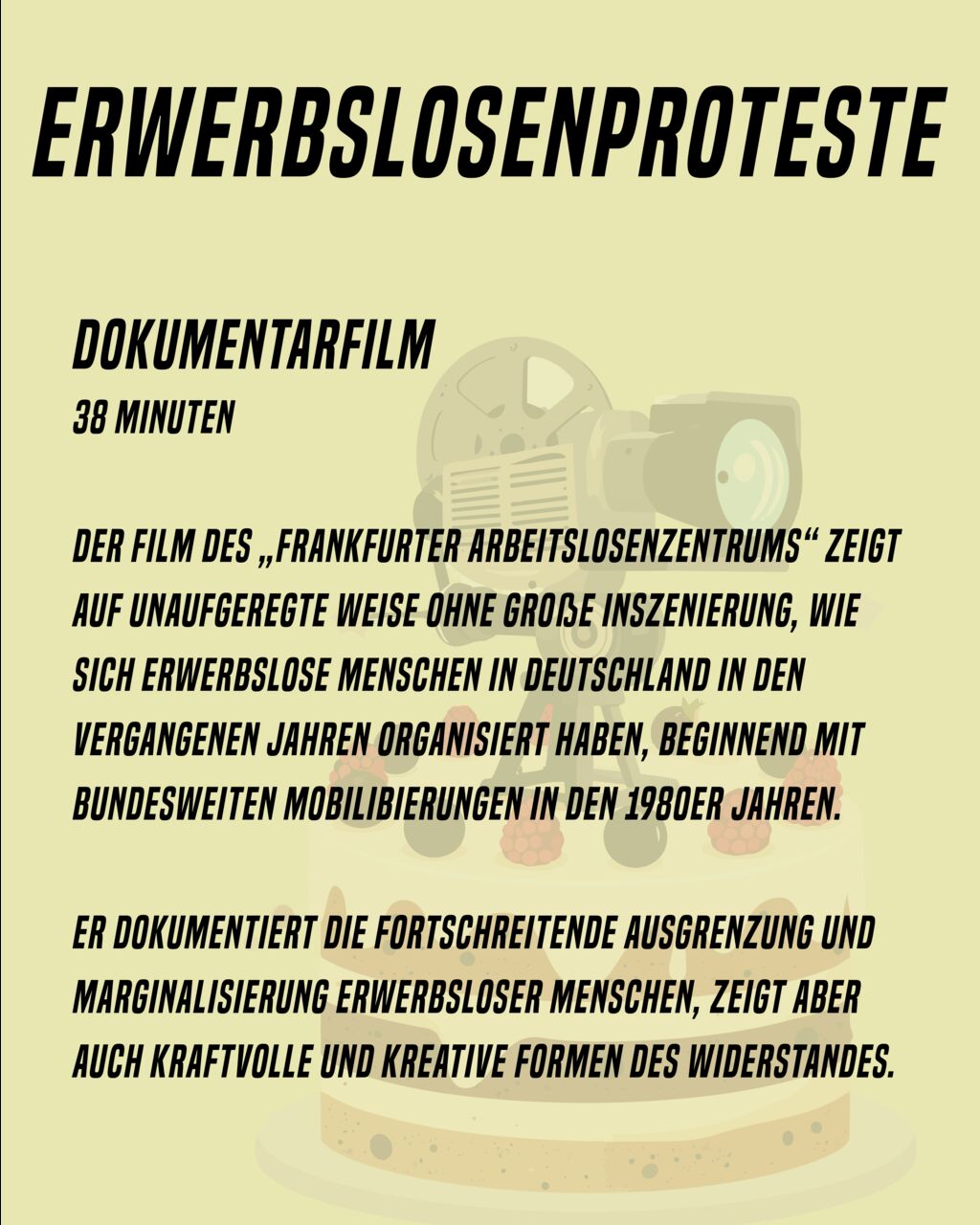 Der Film des „Frankfurter Arbeitslosenzentrums“ zeigt auf unaufgeregte Weise ohne große Inszenierung, wie sich erwerbslose Menschen in Deutschland in den vergangenen Jahren organisiert haben, beginnend mit bundesweiten Mobilibierungen in den 1980er Jahren.