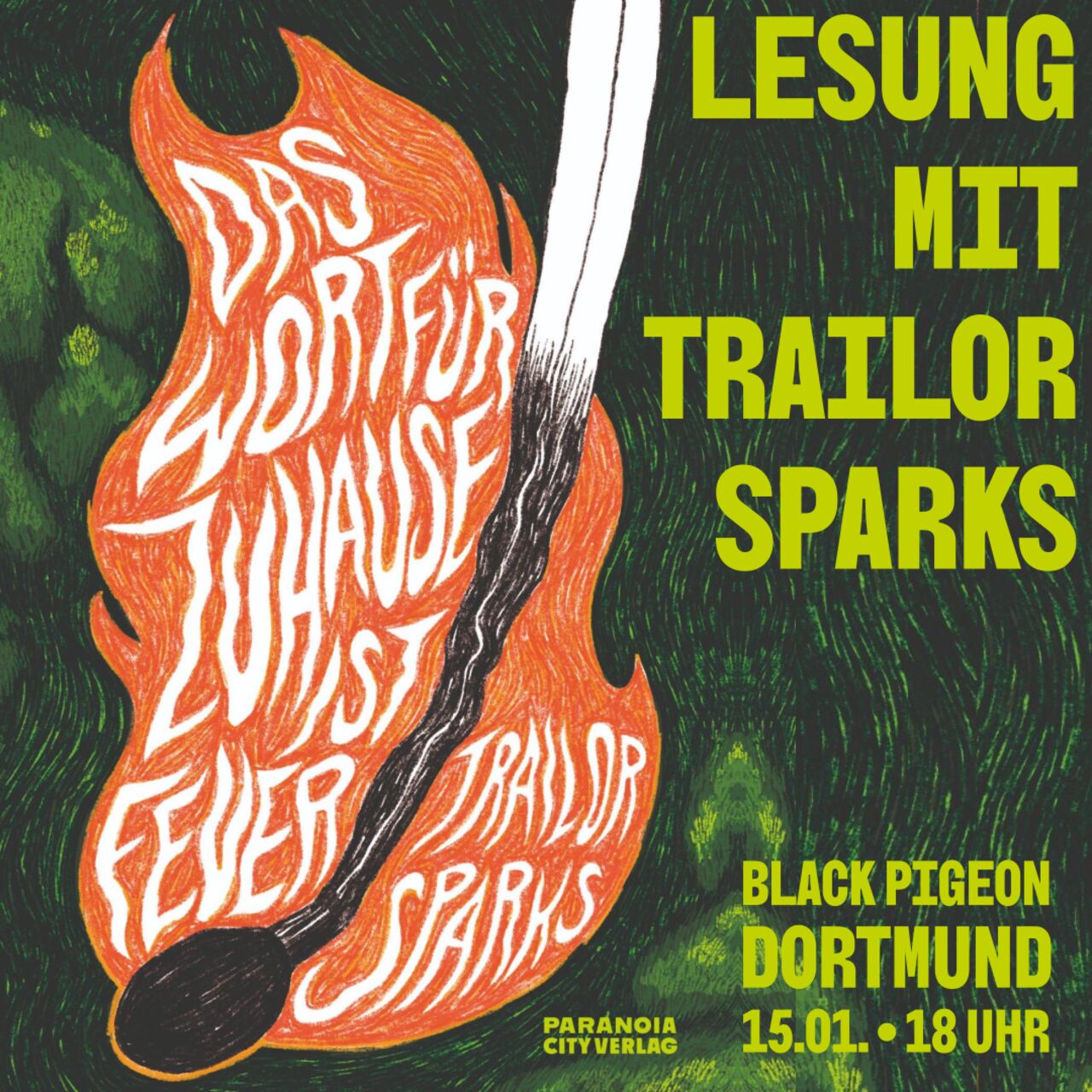 Sharepic für die Lesung am 15.01. mit Trailor Sparks. Das Bild ist in einem post-impressionistischen Design. Im Hintergrund wird ein Wald angedeutet. Auf der linken Seite ist ein Streichholz das brennt. In der Flamme steht in weiß “Das Wort für Zuhause ist Feuer” und “Trailor Sparks”. Auf der rechten Seite in der oberen Hälfte steht in Grün und groß “Lesung mit Trailor Sparks”. In der rechten unteren Ecke steht in Grün “Black Pigeon Dortmund 15.01. • 18 Uhr”.