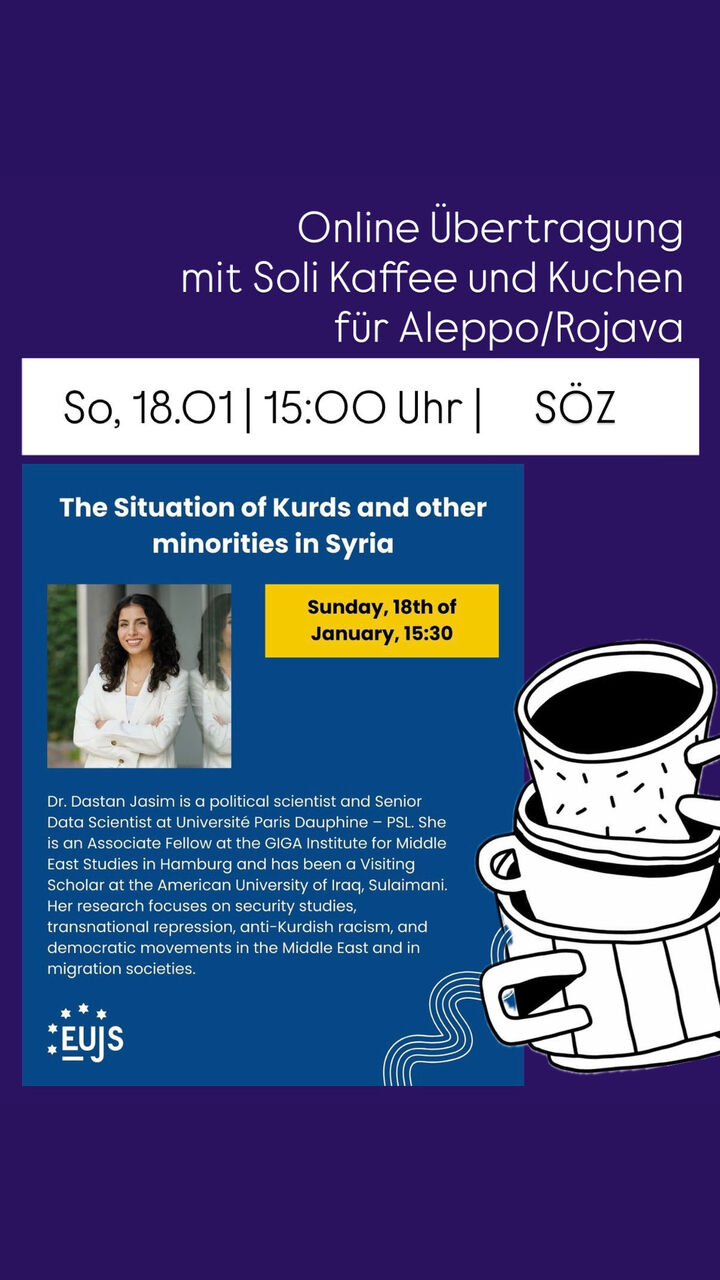 Am Sonntag übertragen wir Live den Vortrag von Dr. Dastan Jasim über die aktuelle Situation in Syrien. Es wird Soli Kaffe und Kuchen und eine Spendenbox für Hilfe vor Ort geben. Wir freuen uns auf euch!