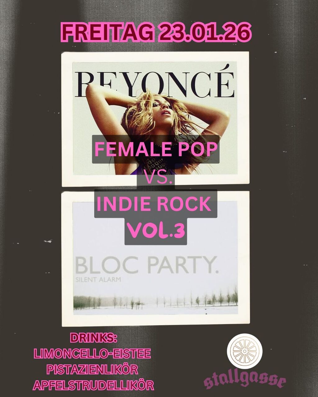 Wir laden zum dritten Mal zu "Female Pop vs. Indie Rock" ein und ihr könnt euch wieder entscheiden. Was mögt ihr mehr? Beyonce oder Bloc Party? Limoncello-Eistee oder Pistazienlikör? Oder doch den Apfelstrudellikör?