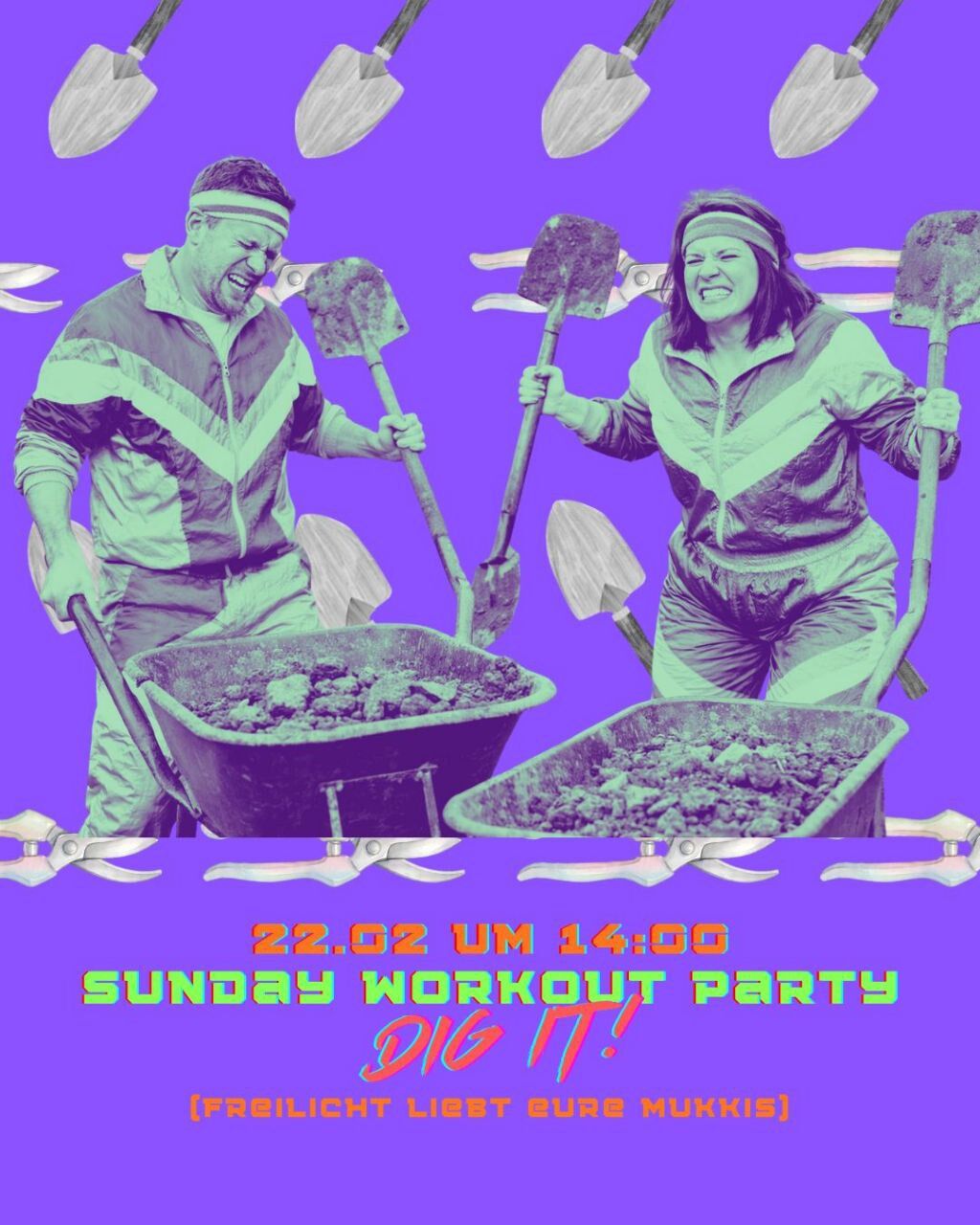 Dann schwing dich in deinen pinken Turnanzug und komm zum Erde schaufeln an unserer Sunday Workout Party am 22.02. von 14-18 Uhr!