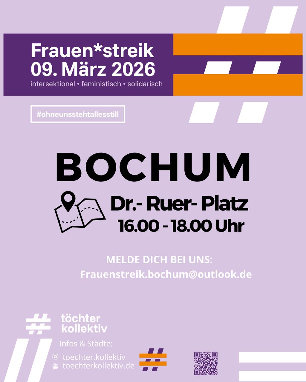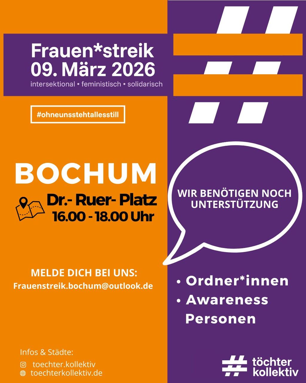 Kommt zum Intersektionalen-feministischen Frauenstreik am 09.03.2026, der bundesweit vom Töchterkollektiv koordiniert wird. Sehr gern laden wir ein, den Streik solidarisch zu unterstützen – z.B. durch Weiterverbreitung des Aufrufs, Auslage von Flyern oder Teilnahme an der Kundgebung.