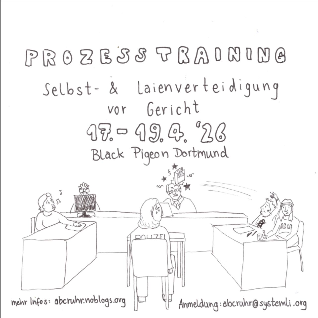 Von der Aktion über die erste Post durch den Gerichtssaal bis zum Urteil (oder sonstigem Ende des Verfahrens) wird der Gang eines Strafverfahrens erörtert – und wie mensch sich dagegen wehrt: Gesetzestexte lesen und kreativ anwenden, offensiver Umgang mit Repressionsbehörden, politische Durchführung der Hauptverhandlung und vieles mehr…