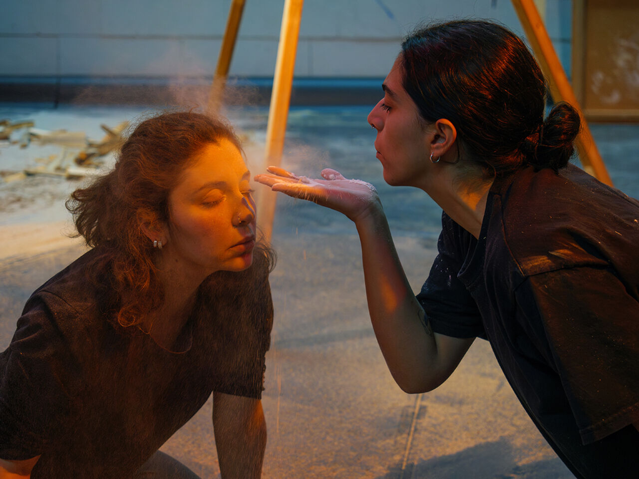 In einem Brachland bewegen wir uns durch Spuren von vergangenen und bestehenden Kämpfen. Ein Atemzug, ein Geste, ein Gefühl – Zeichen des Aufbegehrens brechen sich durch Körper, Stimme und Raum bahn. Die Performerinnen tragen Verluste und Hoffnungen an die Oberfläche, lassen ein verkörpertes Archiv sprechen und transformieren Zerstreuung in Zusammenhalt. In einem Raum des kollektiven Erinnerns, des Trauerns, der Ermächtigung und der Zelebration, zerbrechen Trümmer und werden neu rekonstruiert. Das Stück fragt danach, wie Erinnerungen an diese Kämpfe – oft ausgelöscht oder verdrängt – durch Körper, Stimme, Bewegung und Musik wieder erfahrbar werden können.