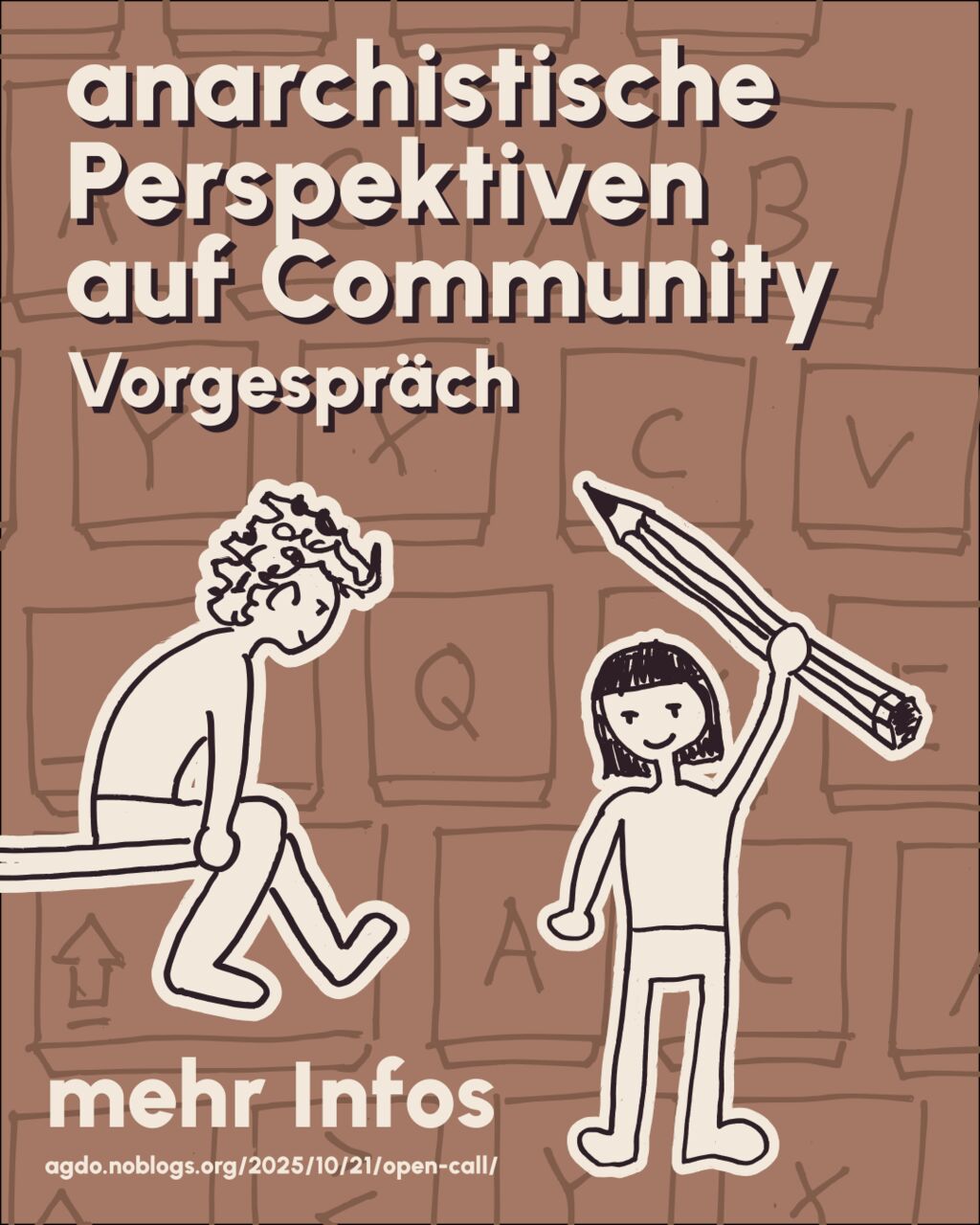 Wir wollen am 06.11. ab 18 Uhr gemeinsam anarchistische Perspektiven auf Gemeinschaft entwickeln. Wir diskutieren in einer Runde verschiedene Fragestellungen als Teil einer Reihe zum Open Call mit dem selben Thema.