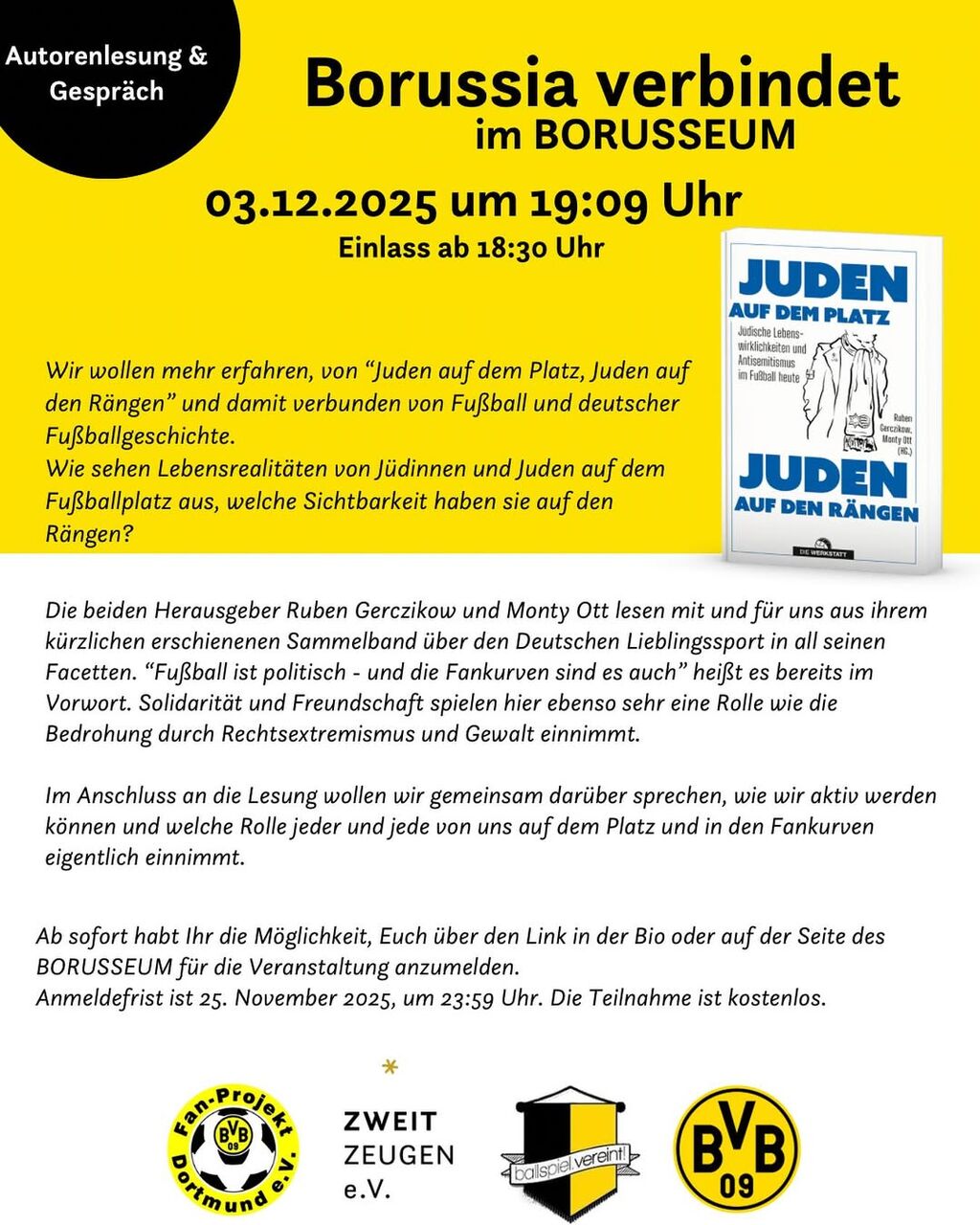 Wir wollen mehr erfahren – von „Juden auf dem Platz, Juden auf den Rängen“ und damit verbunden von Fußball und deutscher Fußballgeschichte. Wie sieht die Lebensrealität von Jüdinnen und Juden auf dem Fußballplatz aus, welche Sichtbarkeit haben sie auf den Rängen? Dazu findet eine Lesung mit anschließendem Gespräch mit Ruben Gerczikow und Monty Ott im BORUSSEUM statt.