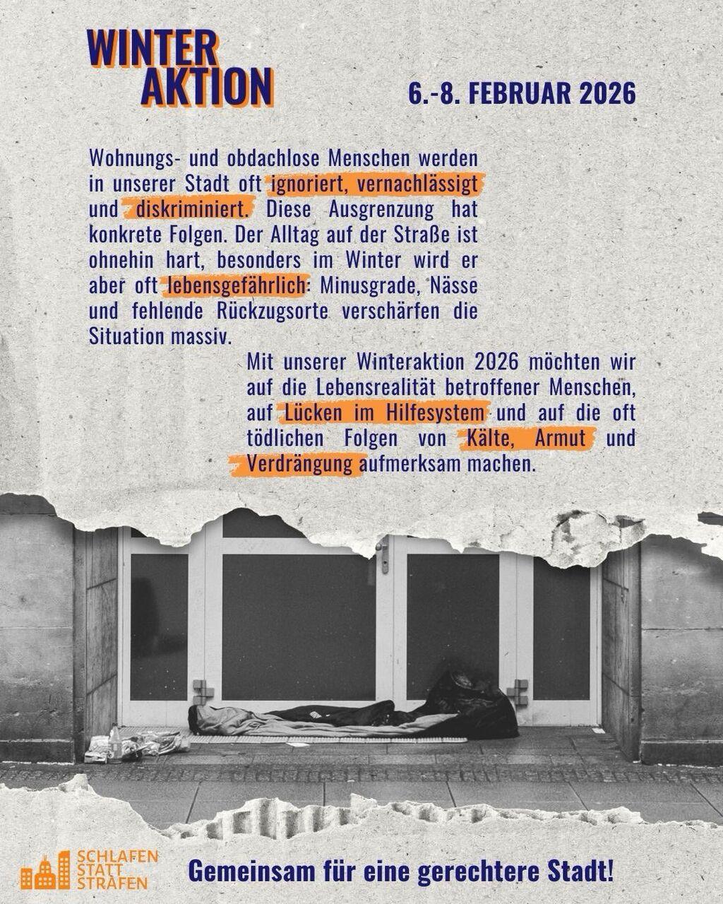 Mit unserer Winteraktion 2026 möchten wir auf die Lebensrealität betroffener Menschen, auf Lücken im Hilfesystem und auf die oft tödlichen Folgen von Kälte, Armut und Verdrängung aufmerksam machen. Am 6. Februar 2026 ab 15 Uhr besetzen wir deswegen 48 Stunden lang, rund um die Uhr einen Infostand in der Dortmunder Innenstadt. Außerdem bieten wir vor Ort: